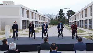 Durante el acto que se llevó a cabo el martes en el Desarrollo Urbanístico Procrear II de San Martín, estuvieron presentes el ministro de Desarrollo Territorial y Hábitat, Jorge Ferrraresi; el ministro de obras públicas de la Nación Gabriel Katopodis; la ministra de Gobierno de la Provincia, Teresa García, y el intendente de San Martín, Fernando Moreira.