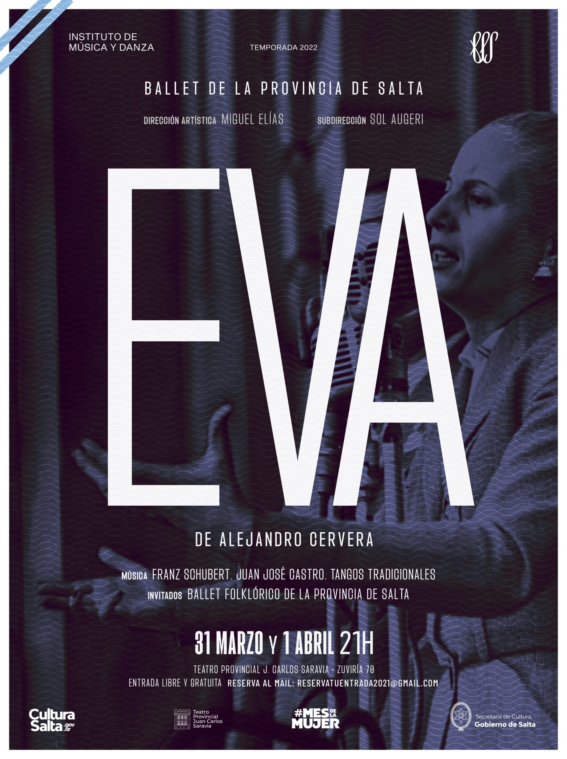 En esta oportunidad el reconocido coreógrafo Alejandro Cervera es convocado para el montaje de EVA, obra que recrea la figura de Eva Duarte de Perón, nacida en Los Toldos, Provincia de Buenos Aires, quien luego de iniciar una carrera de actriz de cine y radioteatro se convierte en una de las grandes personalidades de la política argentinas del siglo XX. La música de Franz Schubert, Juan José Castro y tangos tradicionales dan marco a esta conmovedora historia y el Ballet Folklórico de la Provincia ¨Gral. Martin Miguel de Güemes¨ colabora como invitado en esta nueva producción del IMD.