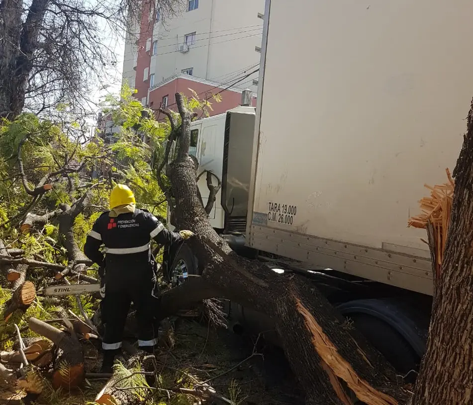Tras una alerta recibida al 105 se derivó una cuadrilla de Operadores de Emergencia para proceder a liberar un pesado camión que, a su paso, arrastró varias ramas de gran porte que cayeron sobre la carrocería del transporte y en la vía pública obstaculizando el tránsito en la zona.