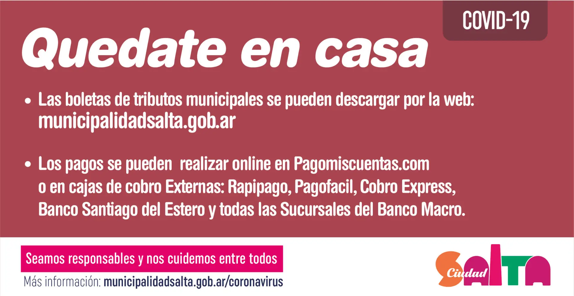 En el caso del pago de los tributos municipales inmobiliarios, del automotor y comerciales, las boletas se pueden imprimir accediendo al link: http://municipalidadsalta.gob.ar, eligiendo el impuesto que se desea abonar y haciéndolo a través de pagomiscuentas.com.ar y del Botón de Pago Eléctrónico de la web de la Ciudad.